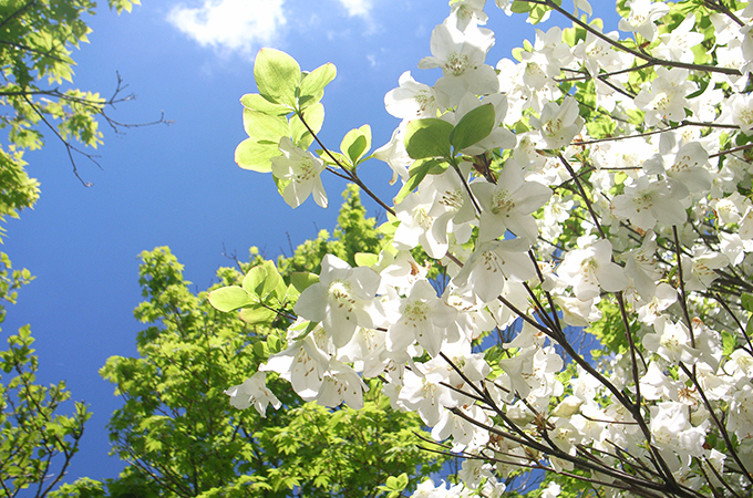 青空の下、白い花と木々の新緑が生み出す上品なコントラストは絶景です。